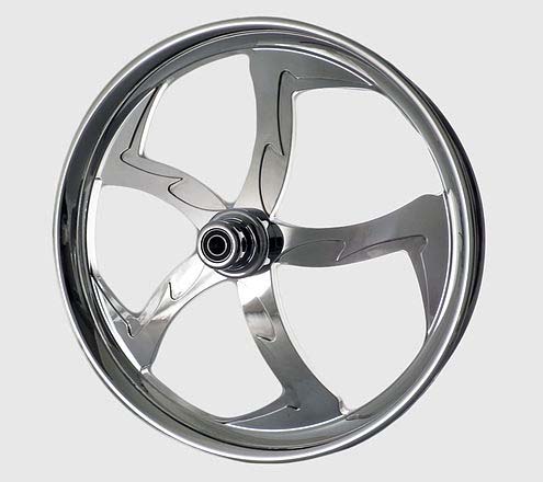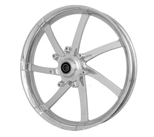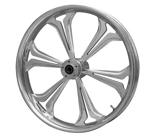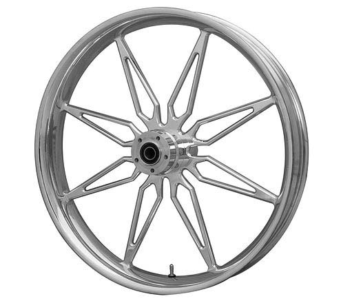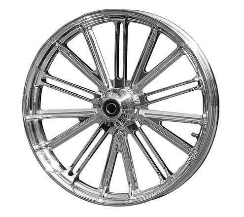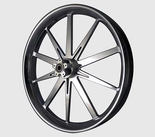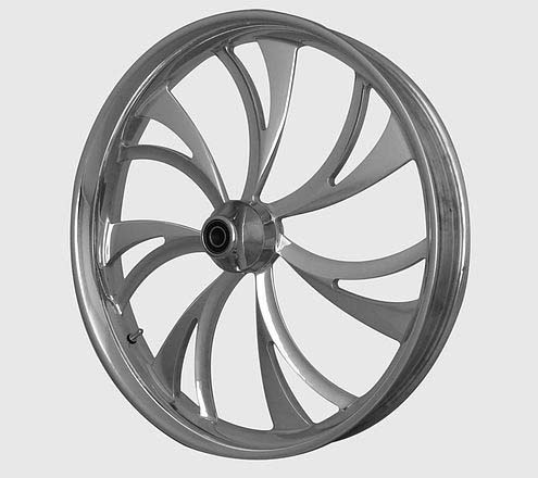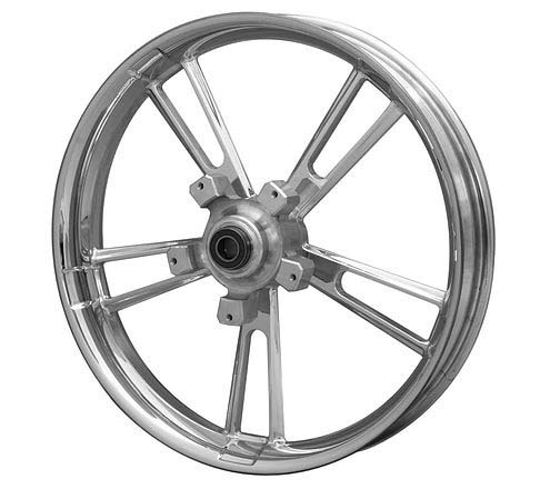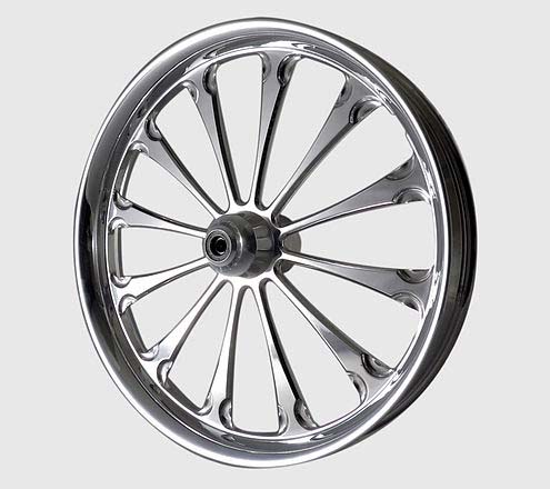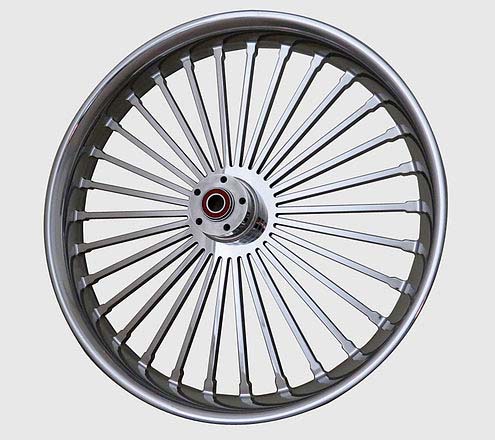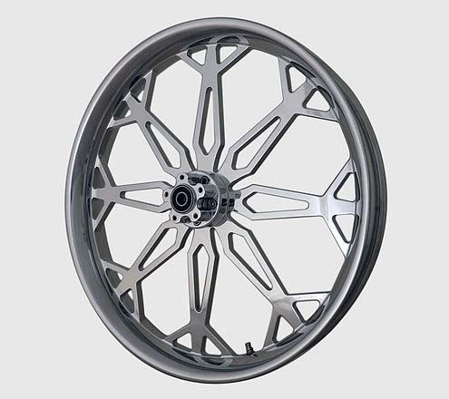 This wheel comes in sizes 16", 17", 18", 19", 21", 23", 26", 30" and 32" in polished, powder coated black or chrome. This style is made for Harleys only.