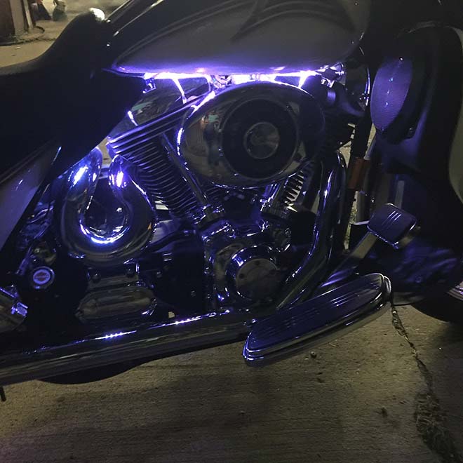 These fun lights serve two purposes. Turn them on in solid mode for extra lights to be seen while riding (just don't use red or blue). Then when stopped at your favorite local hang out turn on one of the flashing modes to get even more attention with your bike.